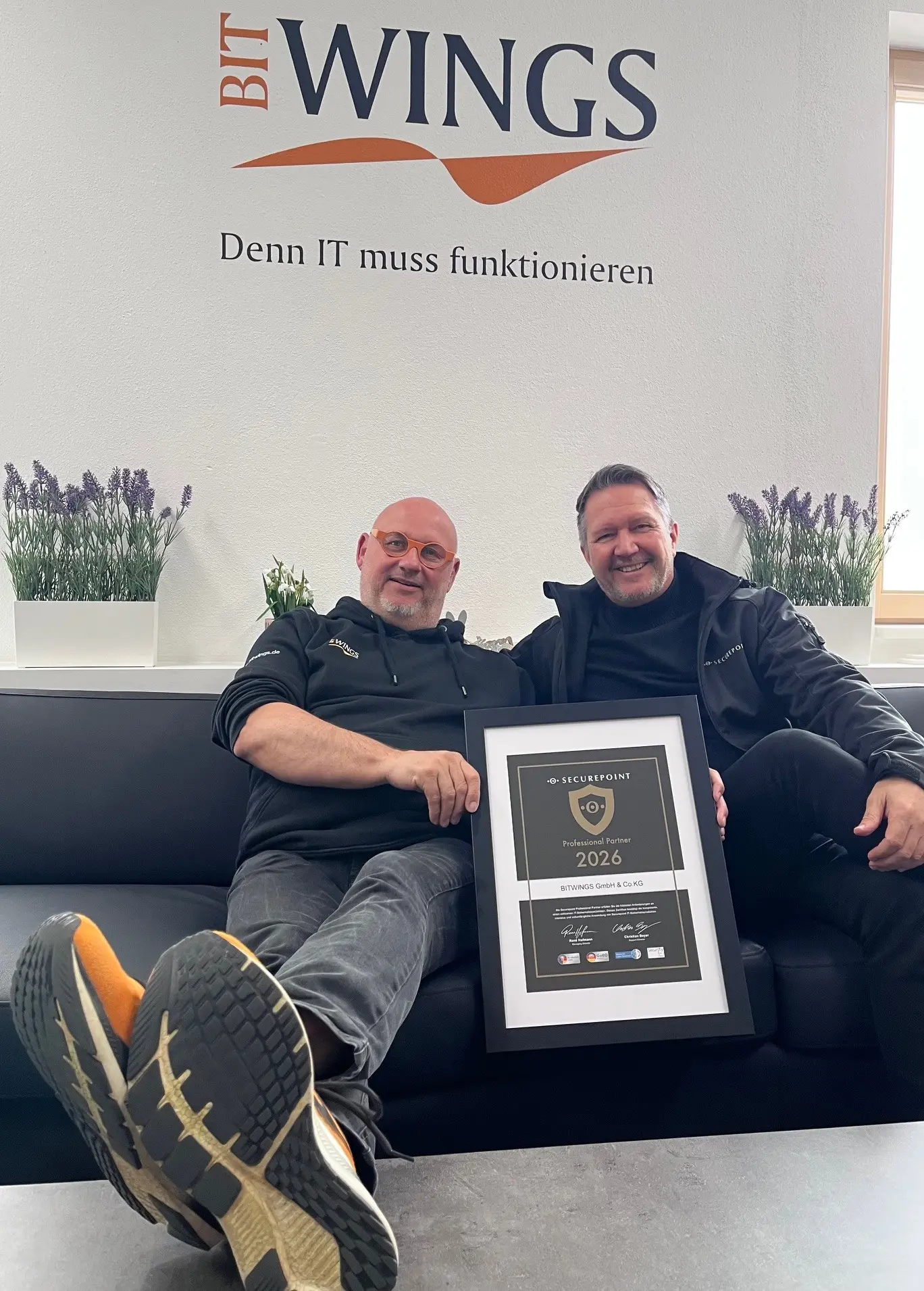 Foto: (c) BITWINGS Das Foto zeigt unseren Geschäftsführer Wolfgang Geng (links) mit Matthias Matz von der Securepoint GmbH.