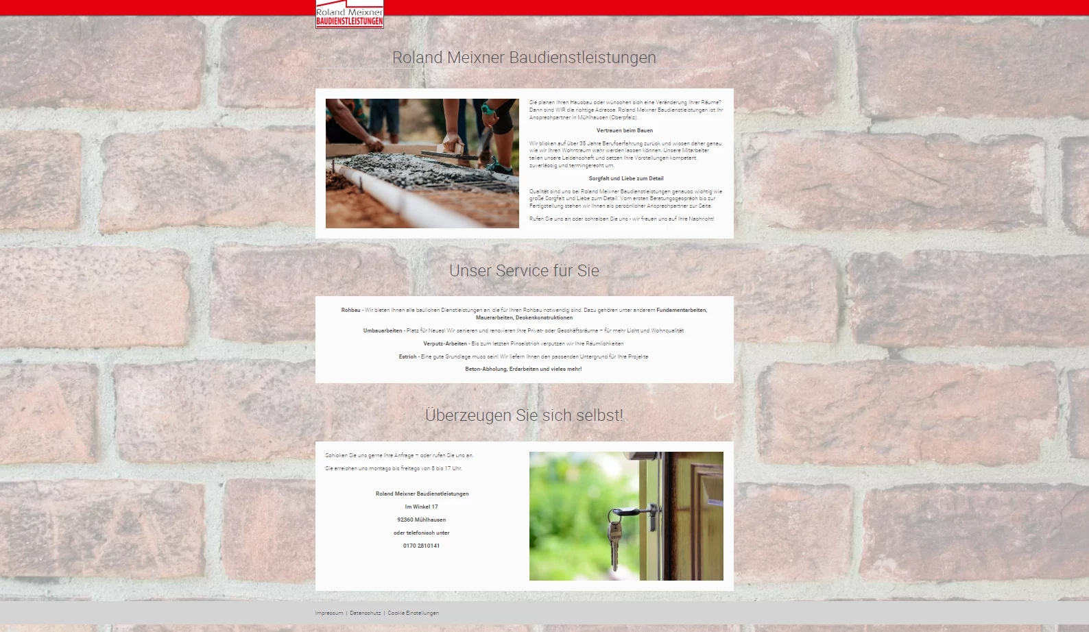 Die Firma "Roland Meixner Baudienstleistungen" war einer dieser Kunden. Gemeinsam haben wir uns an ein schlichtes Design herangetastet, das die Farben des Unternehmens widerspiegelt, den Besucher der Seite aber nicht überfällt. Auch textlich wollte der Kunde eher "schlicht" bleiben. Innerhalb eines Textblockes erfährt der User nun das Allerwichtigste über das Unternehmen und den Service, den "Roland Meixner Baudienstleistungen" anbietet. Dazu die Kontaktdaten der Firma und die entsprechenden Seiten für das Impressum und die Datenschutzerklärung.