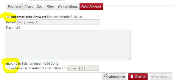 - Vergessen Sie nicht, die Haken bei "Automatische Antwort für eingehende E-Mails" und "Automatische Antwort abschalten am" zu setzen