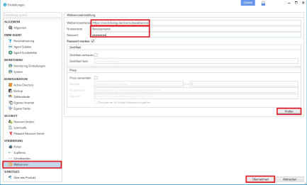 - Navigieren zum Reiter Webservice und Eintragen: